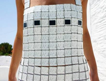 太阳能连衣裙。创新工作室 Principled Design 设计的这条太阳能连衣裙,由“448 个白色电路板组成,可以安装太阳能电池、LED 或光电管”,并带有一个“附加的微控制器”,这件裙子白天吸收阳光能量,晚上发光。