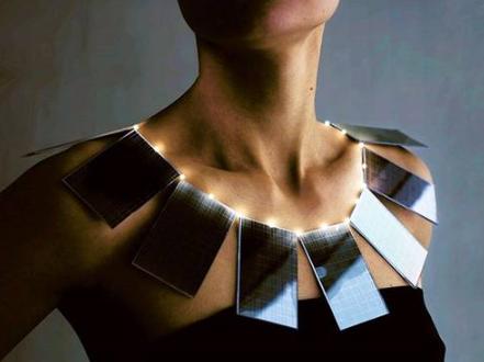 太阳能项链。2009 年,梅·横山美美(Mae Yokoyama)设计了这条太阳能电池板项链,由迷你太阳能电池板和最小的 LED 灯泡组成,通过从太阳中收集能量来发出光亮。