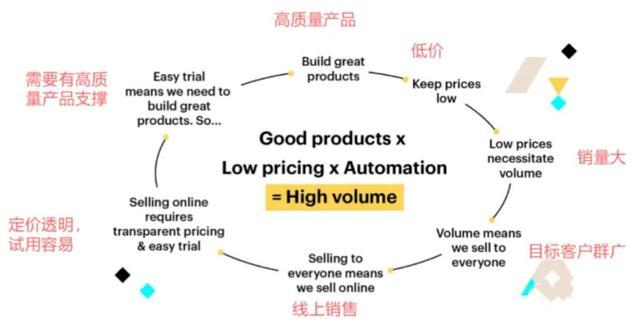 这种商业策略有着如下逻辑前提:终端用户价值的崛起已经成为企业服务领域决定性的力量。PLG 商业策略根本上是寻求一种 C 端低成本驱动增长的规模化获客体系。其底层逻辑是:把产品自身作为增长载体,前期通过免费版或者免费试用的方式,让产品自己“说服”客户,推动获客、留存、拓展的飞轮运转。