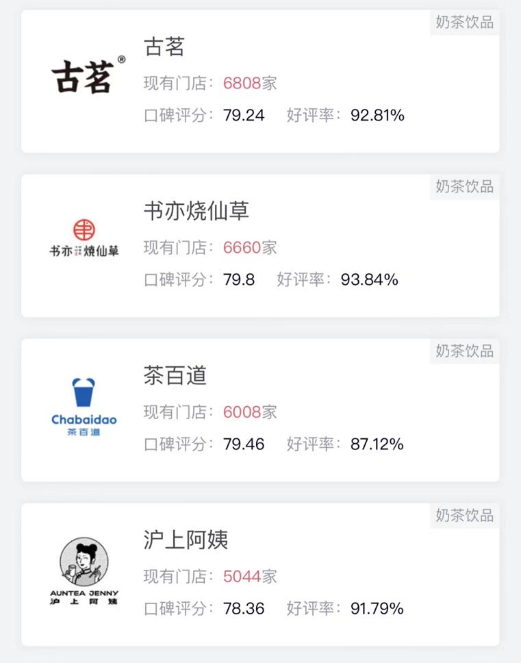 值得注意的是,一点点、益禾堂、CoCo都可、书亦烧仙草、沪上阿姨是2010-2013年左右创立的品牌,古茗、茶百道、甜啦啦都是2017年以后创立的新一代茶饮品牌。