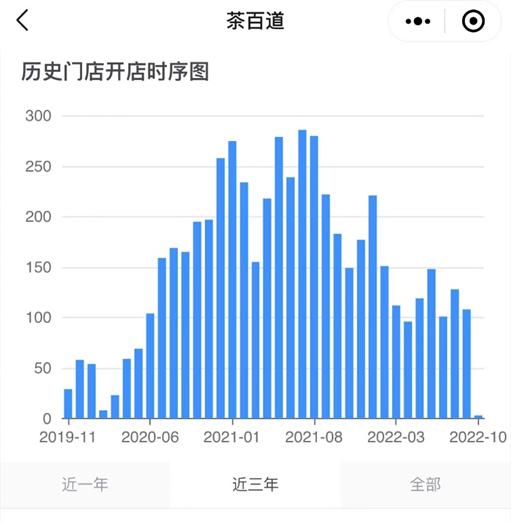 一点点、益禾堂都是其中代表例子,例如一点点在2020年多数月份还能保持月均开店80家的速度,但从2021年开始开店速度放缓,直至今天月均开店40家左右,近三年开店规模在1500家左右。
