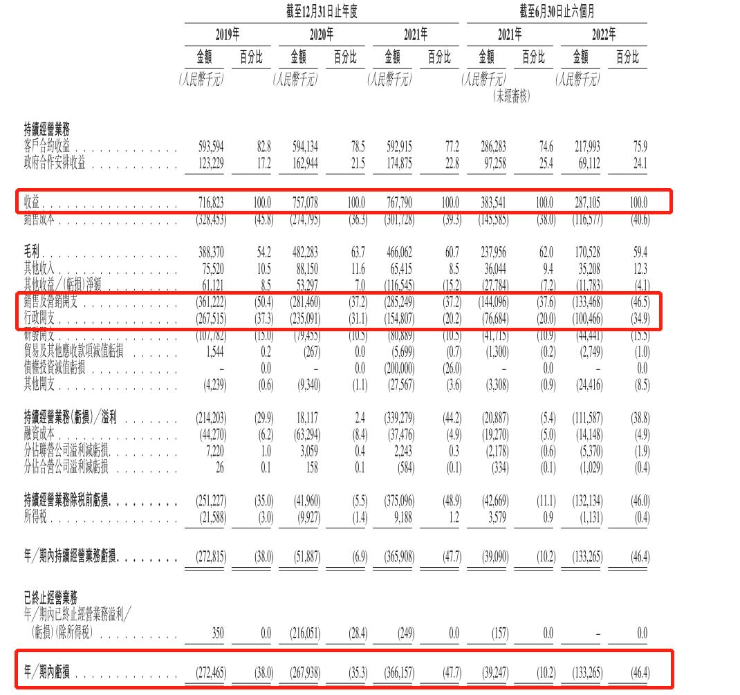 2019年至2021年,公司营业收入分别为7.17亿元、7.57亿元、7.68亿元,净利润分别为-2.72亿元、-2.68亿元、-3.66亿元,处于连年亏损状态。公司称,过往由于就服务及产品产生大额销售、行政及研发开支,故录得大额亏损净额。从招股书看,猪八戒的行政开支、销售开支个别年份占营收比的70%以上。