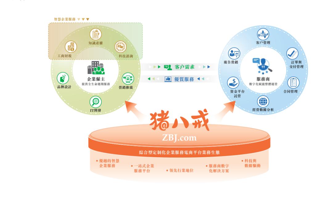 猪八戒给自己的定位是:向企业雇主提供便捷、覆盖企业全生命周期的企业服务,并赋能服务商数字化业务运营提升运营效率。
