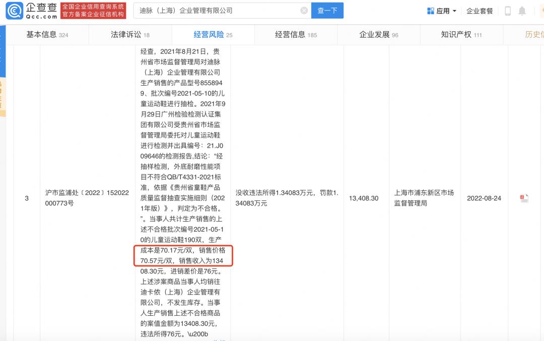 今年内,迪卡侬关联公司因产品问题已经收到了四次罚单。处罚原因除了裤装“纤维含量”不合格外,还有儿童运动鞋“外底耐磨性能项目”不符合标准,被罚款1.34万元。据报道,2018年以来,迪脉(上海)企业管理有限公司还召回了多款存在缺陷的儿童运动服饰相关产品。