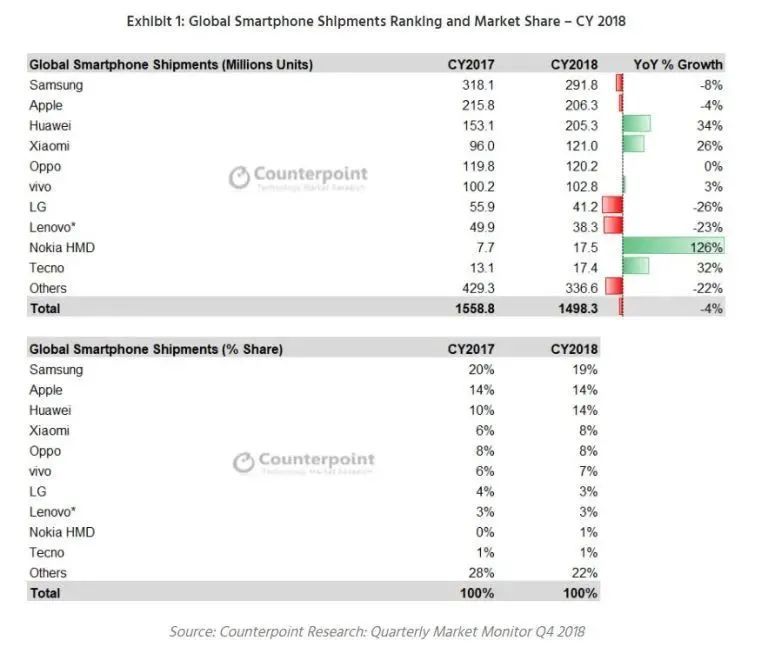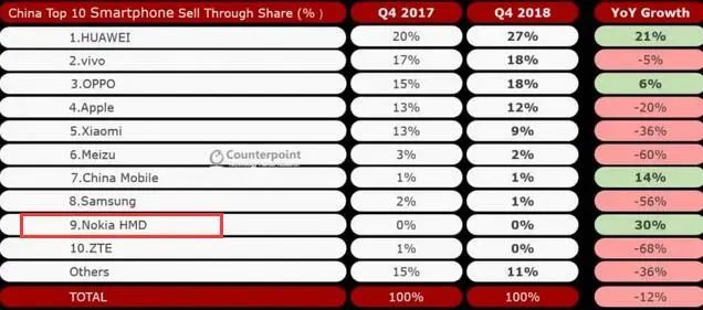 Counterpoint 数据显示,2018 年第二季度,诺基亚全球智能手机出货量达 450 万部,暴涨 782%;全年出货量 1750万部,比 2017 年翻了一倍都不止,杀进全球前十。