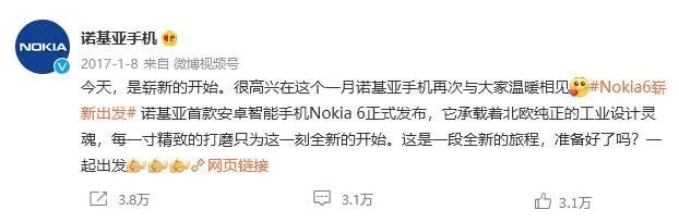 2017 年 1 月 8 日,诺基亚手机在官方微博宣布正式回归,在国内发布诺基亚 6 安卓手机。很快,这条微博的转发评论点赞数都超过了 3万次。什么叫真爱啊!