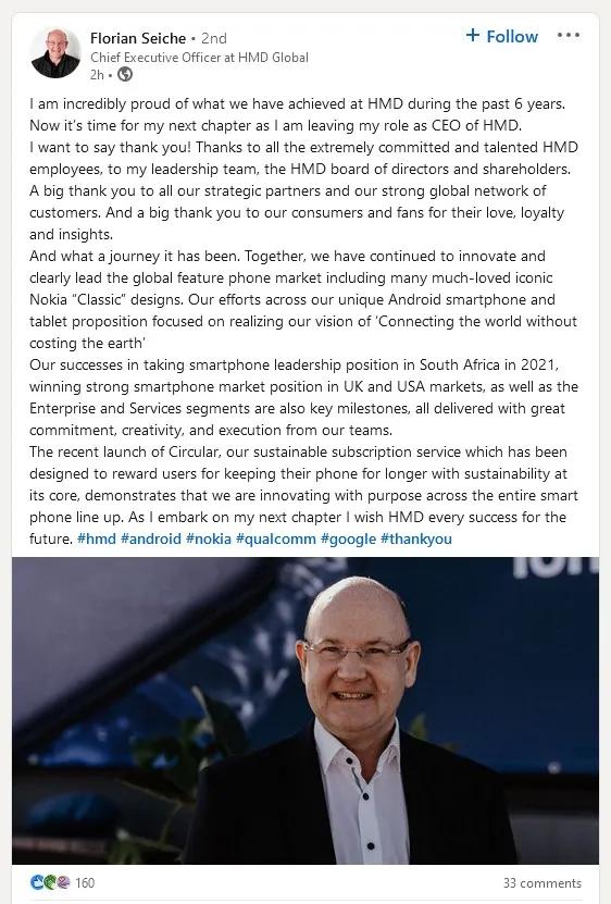北京时间 10 月 11 日凌晨,一条劲爆的消息传到了诺基亚粉丝们耳中。HMD Global 的 CEO,诺基亚移动的负责人 Florian Seiche 在领英上宣布离职。