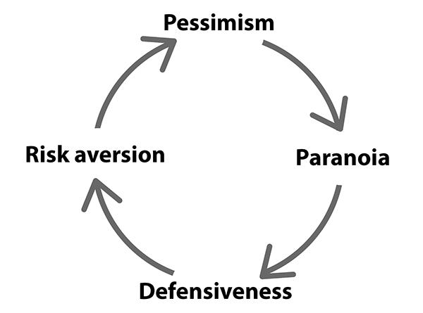 鲍勃·艾格用一个非常简单的恶性循环总结了领导力中的悲观主义问题,如图所示(悲观主义-偏执疑虑-戒备心重-讨厌风险):