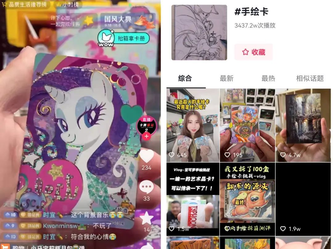 来源/燃次元截图图/手绘卡直播间(左)手绘卡抖音话题(右)