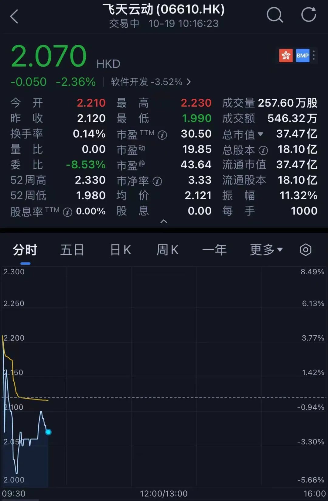 今日,飞天云动开盘在短暂恢复至发行价后,又略微下跌,开盘价为2.21港元/股,截至10月19日10:16,飞天云动的股价为2.07港元/股,跌幅为2.36%,市值则更新为37.47亿港元,约人民币34亿元。
