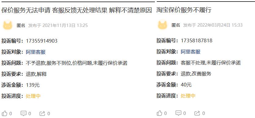 有网友反映,在人工客服等方面淘宝保价服务体验不佳黑猫投诉平台截图