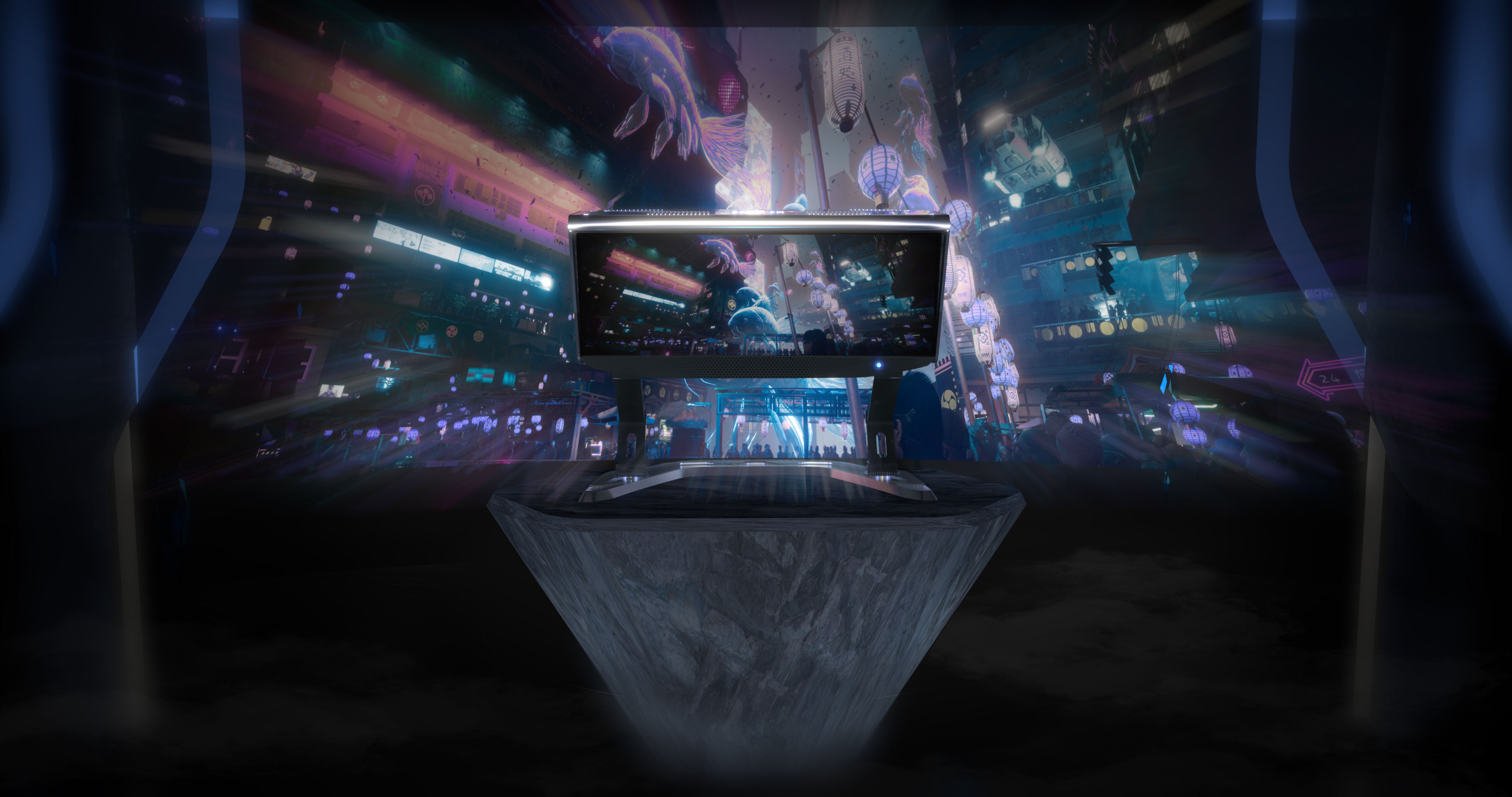 Ultra Reality将新颖物理和计算机光学领域的最新技术与超圆锥广场扩展技术相结合,提供了一个120英寸以上的大型曲面显示器,可提供具有数米真实光学深度的全景影院级虚拟图像。