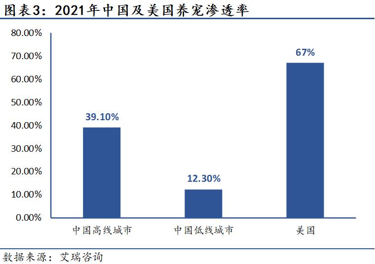 对比宠物行业已迈入成熟发展期的美国、英国等国家,可以明显看出我国的宠物行业的渗透率较低。2021年数据显示,我国高线城市养宠渗透率为39.1%,低线城市则为12.3%,而这一指标在美国却高达67%。同时,我国老龄化趋势大概率将保持上升趋势,因此我国在宠物拥有量上还会有较大的提升空间,尤其是在下沉市场,宠物行业未来渗透率将加速提高。