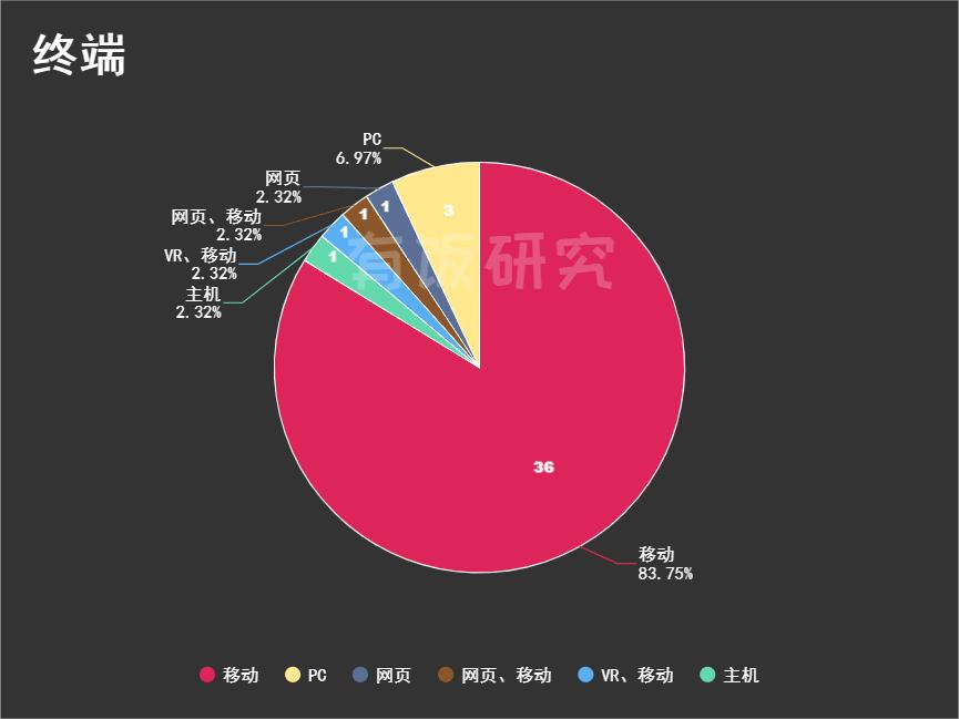 主攻终端平台上,移动端占比最高,有36家,占比约83.7%,其次是PC端,有3家,网页、主机、VR各一家。