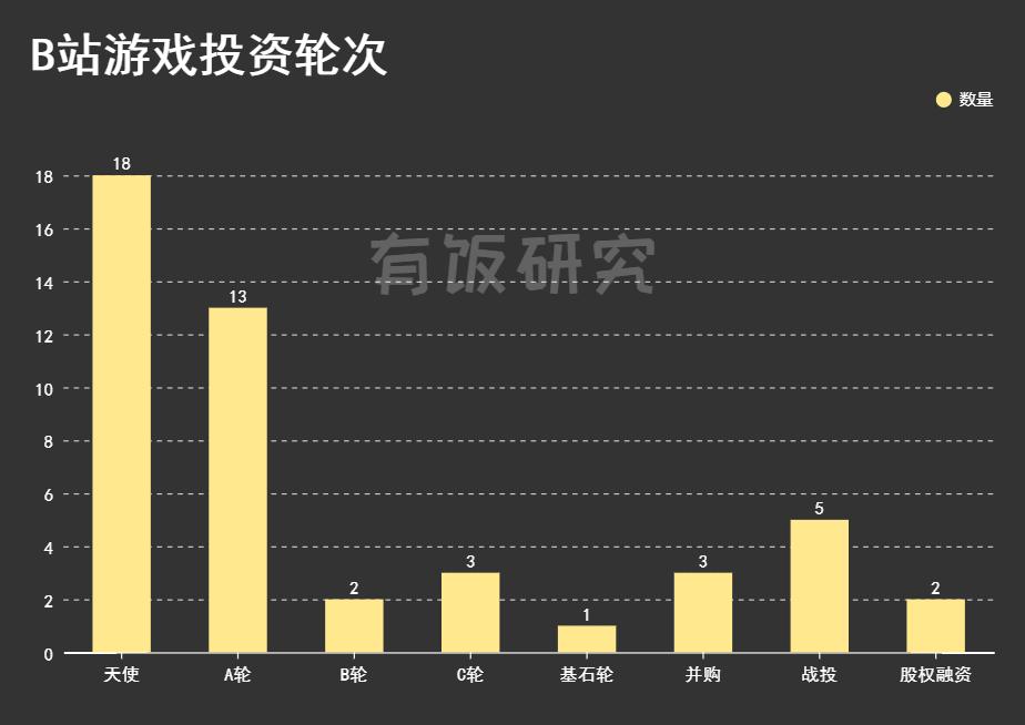 1.3轮次方面,B站在游戏领域的投资以早期的天使轮、A轮为主。其中最多的是天使轮,18次,其次是A轮13次。排在之后的是战略投资,5次,C轮和并购,都是3次。