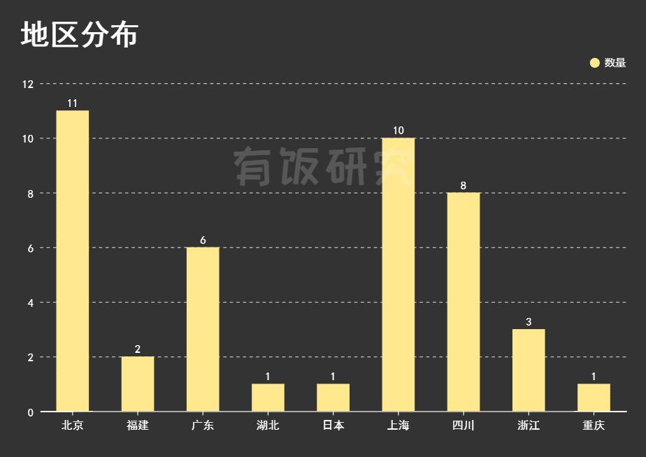 细看国内的话,占比最高的是北京、上海和四川,分别有11、10和8家。之后,广东有6家,浙江有3家,福建有两家。