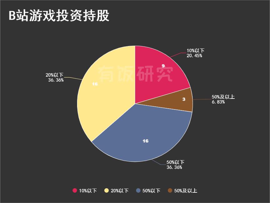 1.4持股比例方面,47次投资里有44次公开了具体的持股情况,整体看来比腾讯网易的平均控股比例稍高,其中占比10%及以上至20%以下的和20%及以上至50%以下的,各有16次,占比约36.36%。