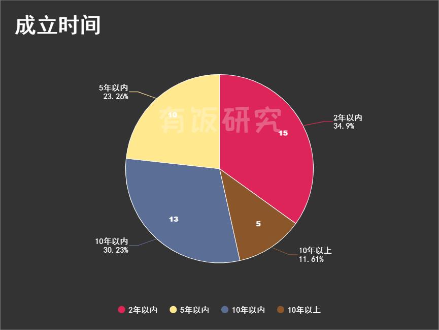 2.2成立时间上,占比最高的是成立两年内的新公司,有15家,其次是成立5年以上十年以内的,有13家,成立2年以上5年以内的有10家,10年以上的最少,有5家。