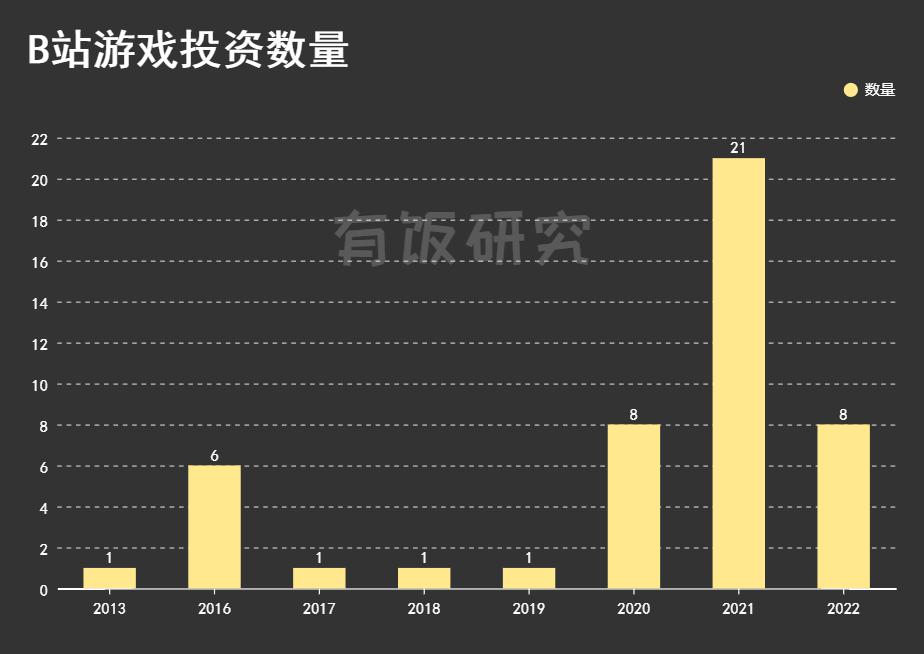 1.1按时间来看,B站游戏投资最多的一年是2021年,有21次,其次是2020年和还没过完的2022年,都是8次。之后是2016年,有6次。