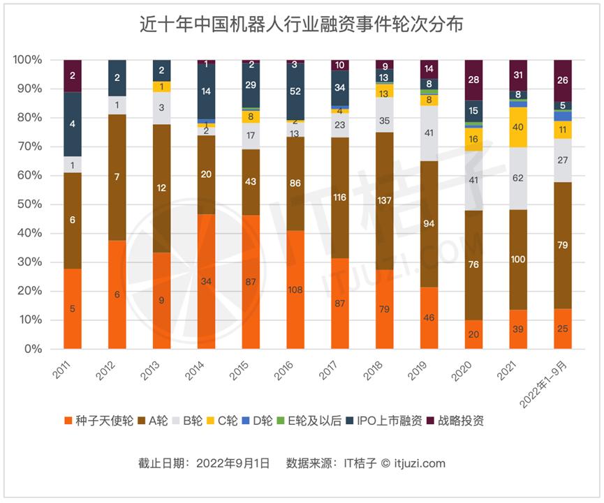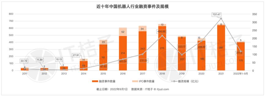 值得注意的是,IPO 上市融资事件也在不断增多,2021 年该事件数量为 31 起,2022 年前 9 个月事件数量为 26 起,中国机器人企业越发受到市场和资本关注。
