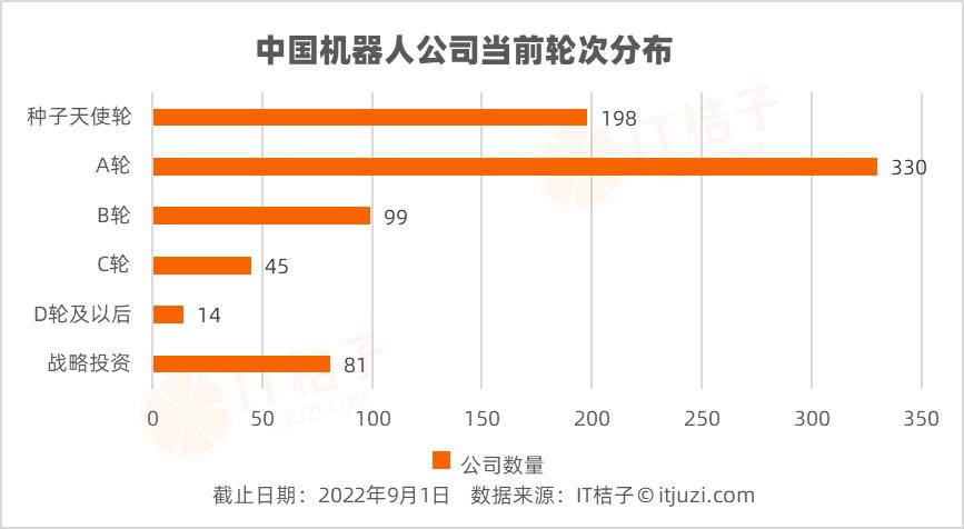 从机器人公司当前轮次分布情况来看,在已获得融资的公司中,目前处于种子天使轮的公司共有 198 家,处于 A 轮的公司数量最多达到 330 家,处于 B 轮的公司为 99 家,处于 C 轮的公司为 45 家,D 轮及以后的公司数量较少共有 14 家,另有 81 家公司处于战略投资轮次状态。