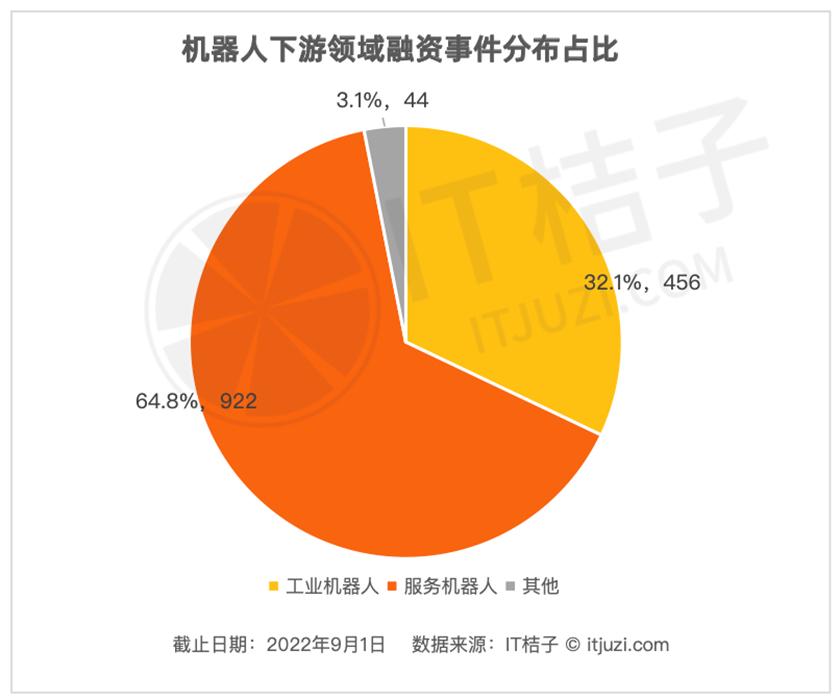 IT 桔子数据显示,中国机器人行业下游领域现有公司 1492 家,其中获得融资的企业共有 615 家,获投率为 41.2%。截止到 2022 年 9 月 1 日,该领域共发生 1422 起投融资事件,融资总规模为 1485.85 亿元。