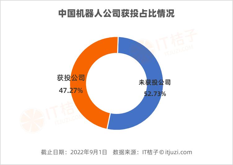 截止到 2022 年 9 月 1 日,中国现有机器人公司总量为 1942 家,其中有近一半的公司拿到融资,数量为 918 家,占到总数的 47.27%。