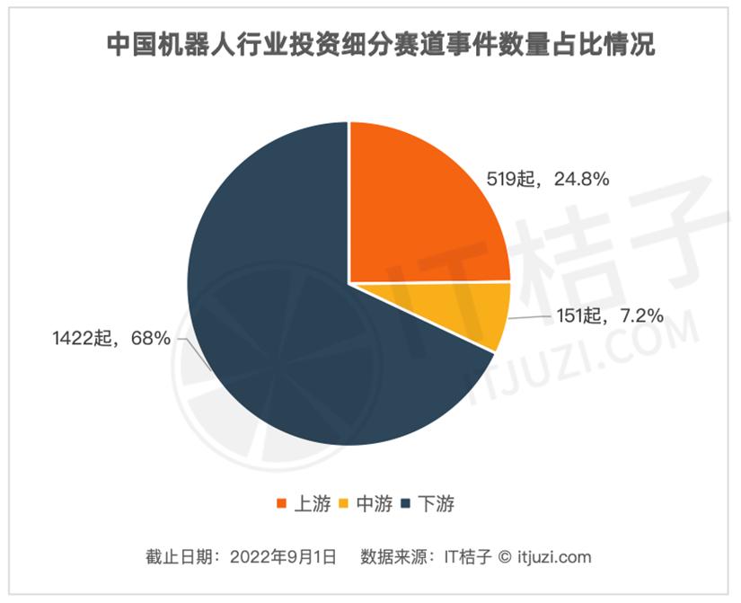 从细分领域情况来看,中国机器人行业无论是历年新增公司数量还是投融资事件数量,均集中在下游应用领域。