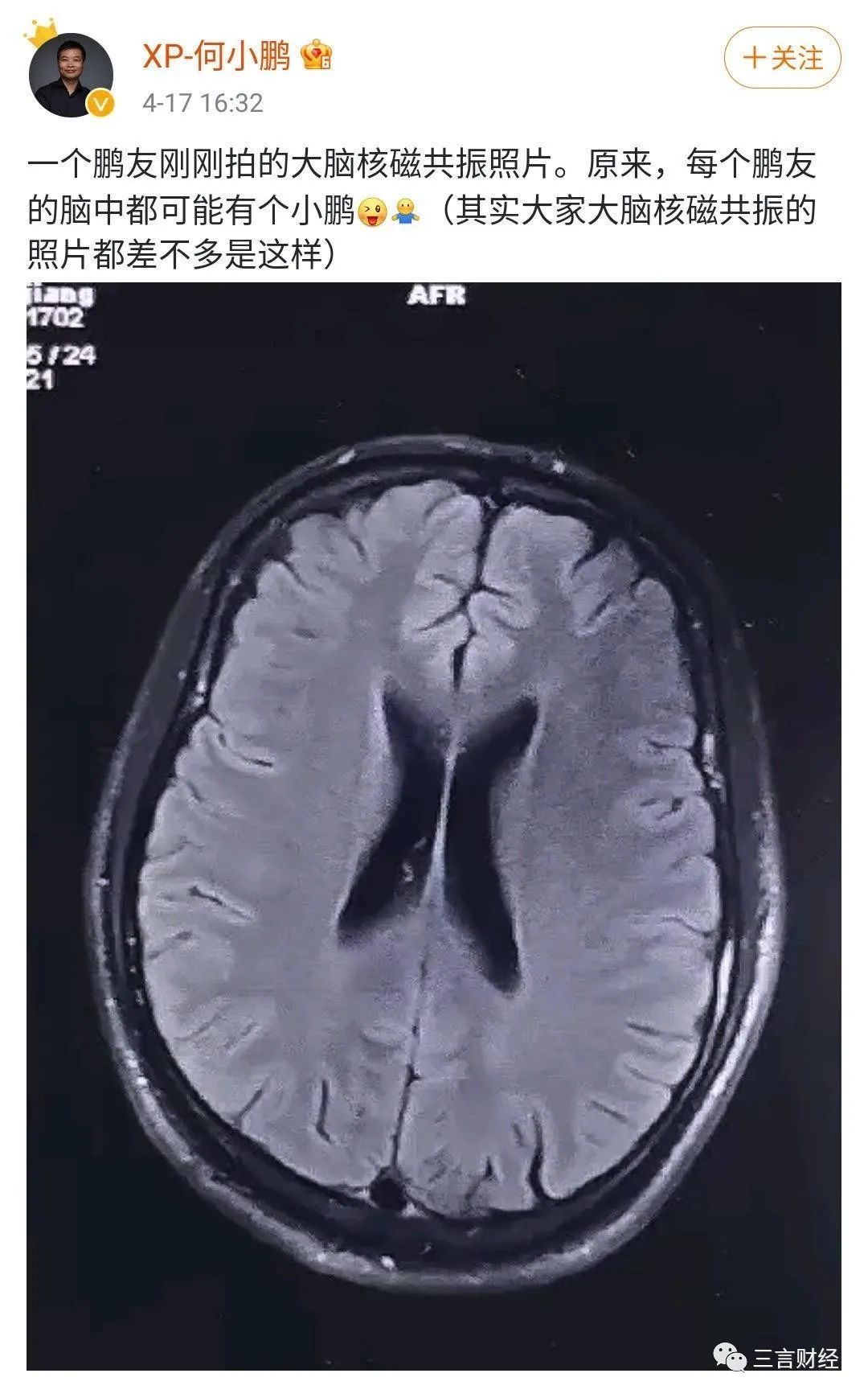去年4月份,何小鹏用车主的脑部核磁图做宣传,也是脑洞大开,当时引发广泛争议,后来何小鹏也主动删了该条微博。