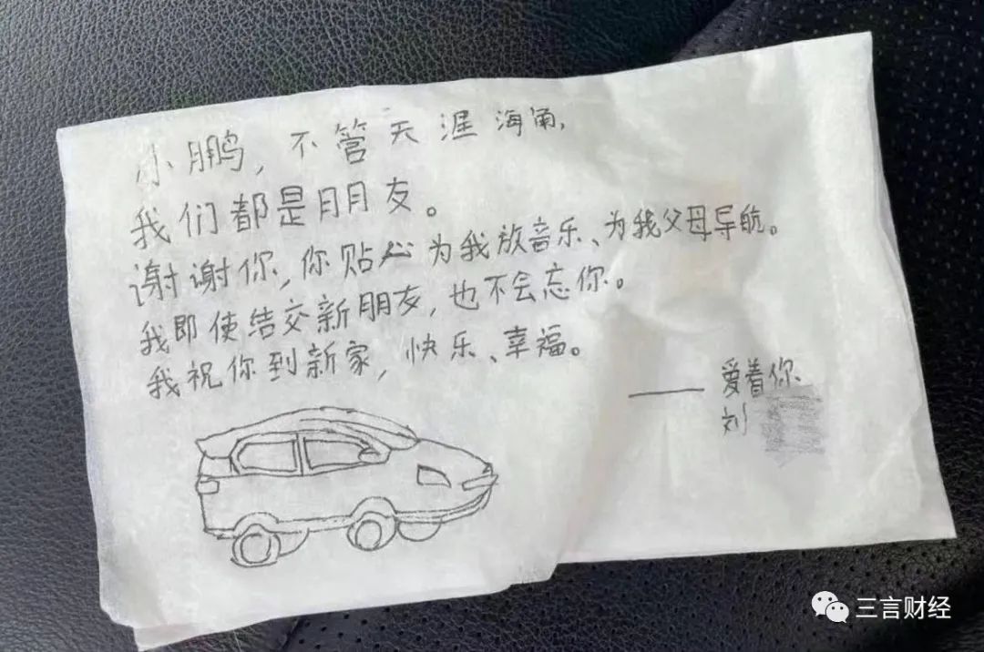 车主女儿还在纸条写下对G3的不舍和感激,“小鹏,不管天涯海角,我们都是朋友,谢谢你,你贴心为我放音乐,为我父母导航,我即使结交新朋友,也不会忘你,我祝你到新家,快乐、幸福”,还手绘了一张小鹏G3的简笔图。