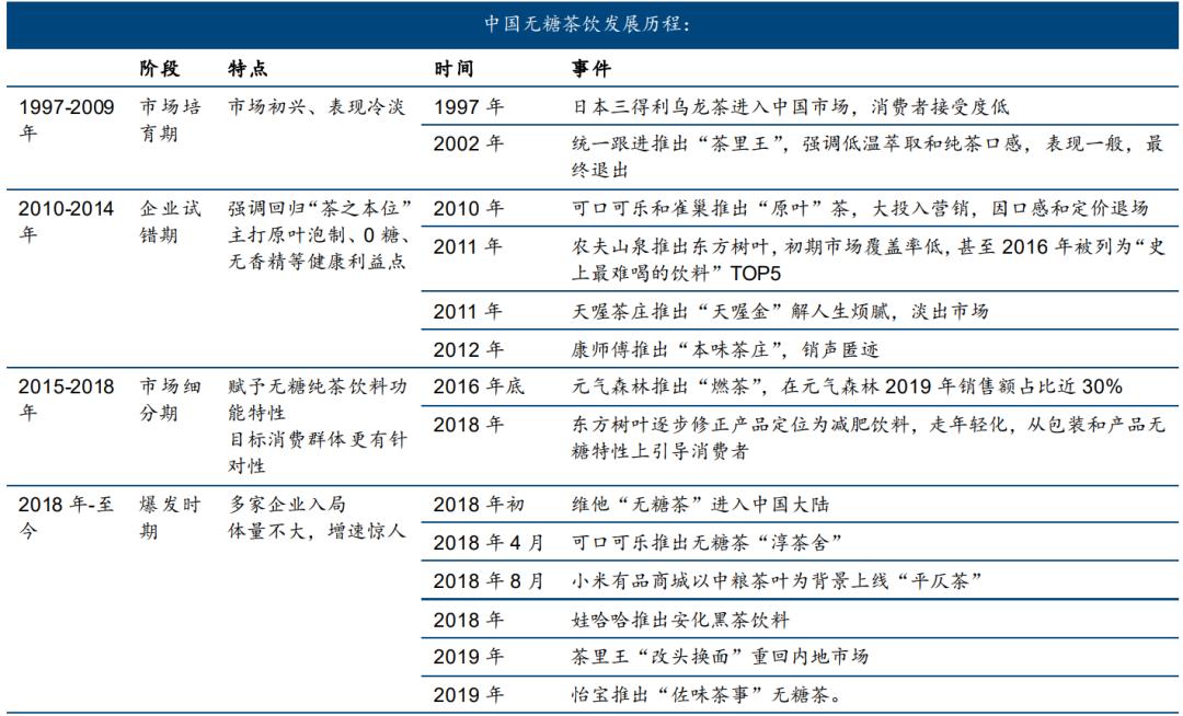 经过岁月变迁和市场发展,无糖茶饮的工业化渐成规模,成为饮料市场上一个重要细分品类。《食品饮料行业“无糖”饮料系列报告》指出,中国瓶装无糖茶饮大约经历了4个阶段:国内无糖茶市场从1993年至今,大致经历了4个发展阶段,分别为市场萌芽期、企业启动期、市场成长期和品类爆发初期。