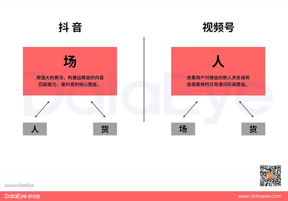 而视频号的状态则更像是“人-货场”,希望依靠用户对微信的熟人关系链和极度高频的日常通讯形成自己的壁垒,以“人”为中心来逐步强化“场”和“货”进一步逐渐探索和搭建更高效的“交易场景”,并能引入更多“货”以提升自己的交易能力。