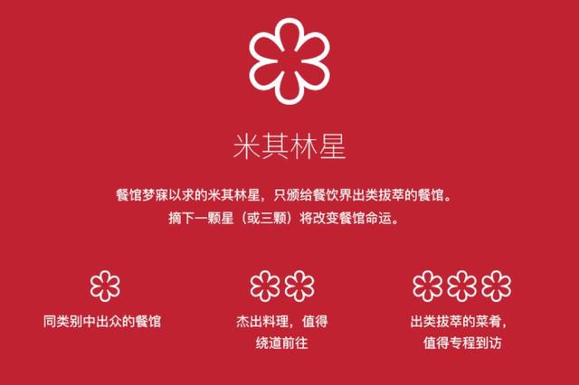 最开始,米其林用一个星星来标记优质的餐厅、酒店等,后来发现一颗星星不够用,逐渐引入了零星、一星、二星和三星的等级制度。1936年,米其林星级排名标准正式推出,成为日后家喻户晓的“米其林三星”。