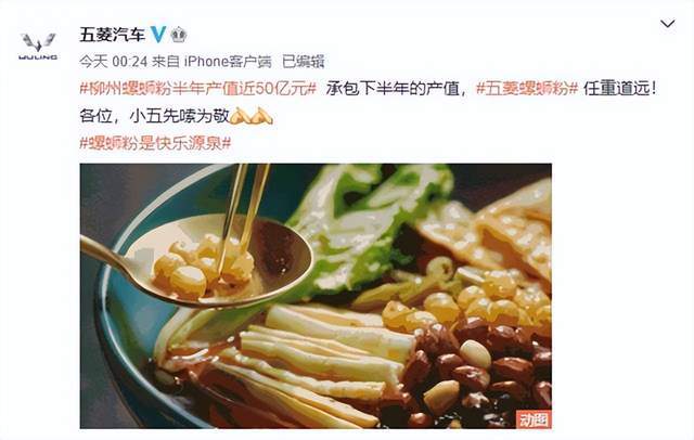 2020年,因为螺蛳粉的火爆,很多人知道了柳州这座城市。这里不仅是螺蛳粉之乡,也是五菱的发源地。眼看消费者对螺蛳粉如此热情,五菱在2020年7月15日发了一条微博:“#柳州螺蛳粉半年产值近50亿元#承包下半年的产值,#五菱螺蛳粉# 任重道远!