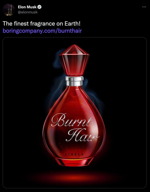 为了名副其实,马斯克最近给一款“地球上最棒的香水”带货。这款香水售价100美元,和宝格丽“前男友”香水价格差不多,由“The Boring Company(一家无聊的公司)”研发售卖。这是马斯克名下的一家不那么知名的公司,主要研究隧道挖掘和城市地下交通。