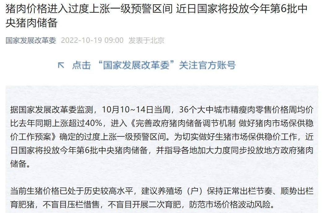 一级预警:猪粮比高于12,或36个大中城市精瘦肉周均价同比上涨40%以上,加大投放力度。