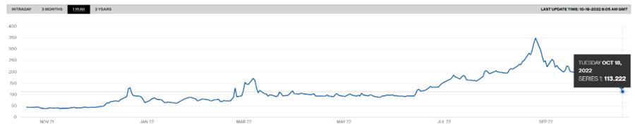 上图为近一年来荷兰TTF天然气价格的走势,可以看出,自今年8月下旬的高点之后,该指数一直呈现出震荡下挫走势。但目前的价格仍比去年同期高出一倍以上,较往年的平均水平更是高出近十倍。这也就是说,欧洲的能源危机仍然存在,远没有到警报解除的时候。