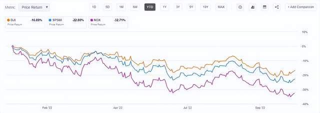 今年以来,三大股指纷纷走低,道指跌了16.28%,标普500跌了22.47%,纳指跌了31.73%。大盘的表现足以证明投资者对于市场的信心在减弱,科技股更是投资者抛售的主要目标。