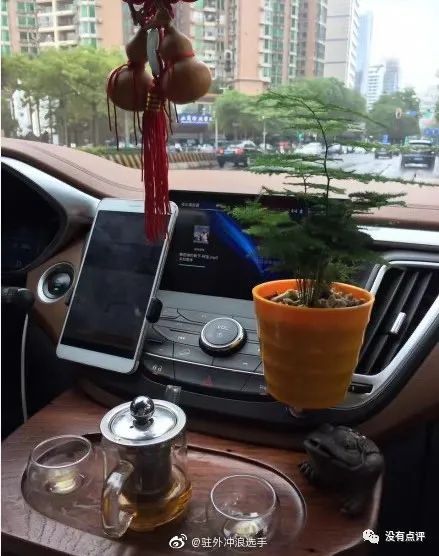 个性化是永恒的需求。一堆人订车的时候花钱买了漆面颜色,然后还精挑细选换色膜,再用一圈碎钻把车牌框上,最后在前车窗放上一排可爱的泡泡玛特。部分大小孩则把“按 F 进入”“自动驾驶中”的贴纸以最大尺寸贴在车窗和车屁股。讲究的潮汕人,则在空调出口放上风车,水杯架位置养个带假山水循环的盆栽,风生水起。最好后排再装个功夫茶套件,马力+50。