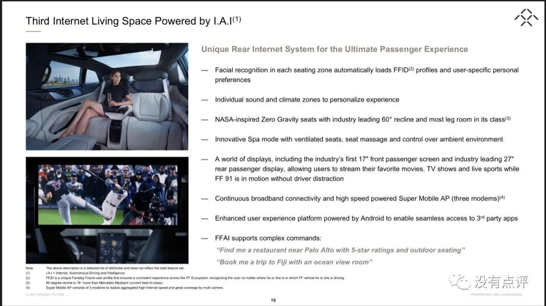 说实话,我觉得很多车企是在吃 FF91 的老本。贾会计虽然造车不行,但是有钱人的品味和诉求那是拿捏得死死的,以至于一个 PPT 还能养活这么多的车型创新。女王座驾,多乘员识别,不同座位间独立音频环境,手机和车机屏幕隔空传送应用功能( 我在车上开个 ZOOM 会议先 )。