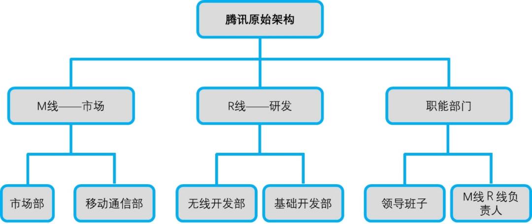 这时候的腾讯公司采用的是职能式组织架构。主要分为渠道、业务、研发和基础架构部门,另设行政、人力资源、内部审计、信息等职能部门。职能式架构在当时的组织规模下简单易行:COO管渠道和业务,CTO管研发和基础架构,上面再由CEO统一协调。