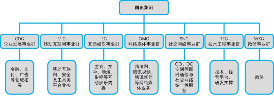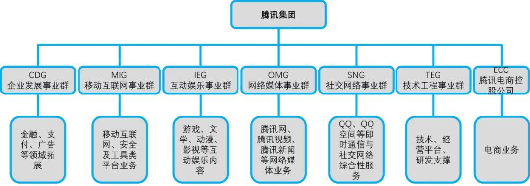 腾讯将集团业务分为企业发展、移动互联网、互动娱乐、网络媒体、社交网络、技术工程6个事业群,再加上腾讯电商控股公司这7个部分。