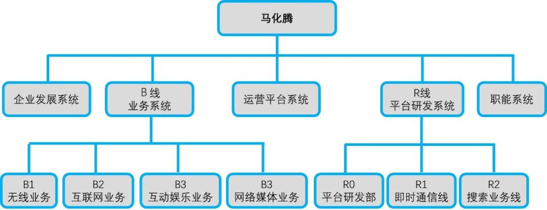 腾讯的总体架构分为企业发展系统、B线业务系统、运营平台系统、R线平台研发系统以及职能系统。B线和R线下设不同的业务单元,业务发展较为独立。