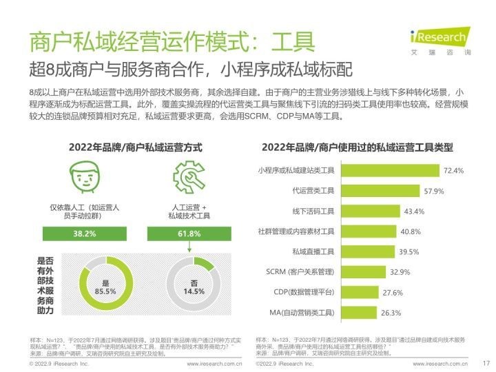 而在私域生机迸发的同时,SCRM厂商也当了一回「风口上的猪」,扶摇直上。SCRM在私域运营流程的运营、成交环节,都充当了重要的角色,《艾瑞咨询:2022年中国商户私域布局洞察研究报告》显示,2022年有超过三成的品牌/商户使用过SCRM工具。