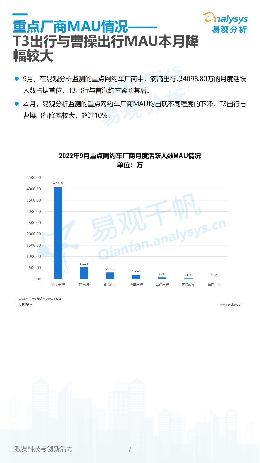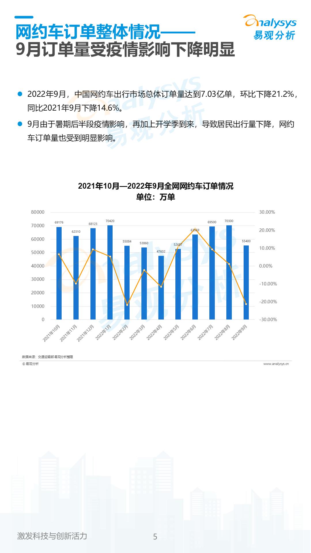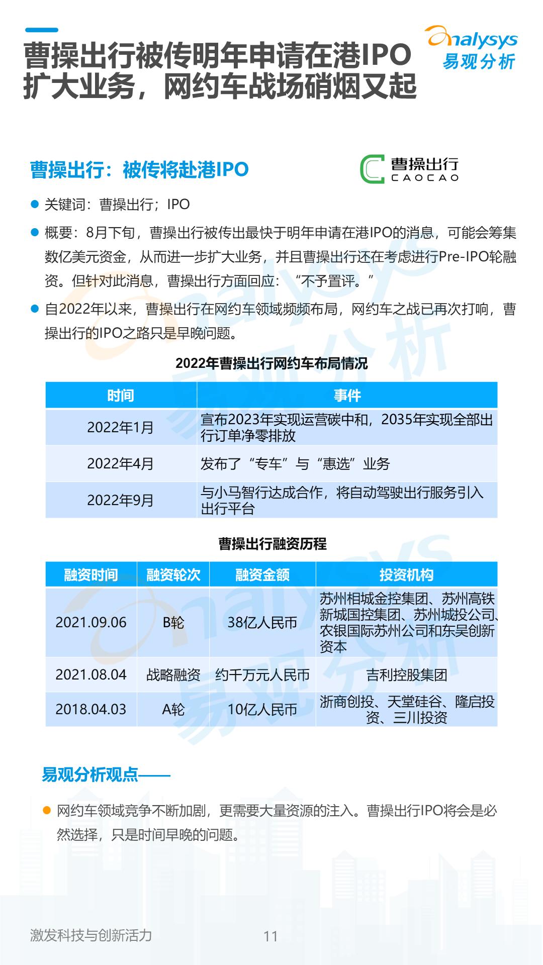 易观分析:2022年9月,中国网约车行业订单量出现大幅下降,主要由于开学季等因素的影响,致使人们出行频率骤减。享道出行成为本月网约车订单量上涨的唯一一家企业,如祺出行在本月依然蝉联合规订单量榜首。滴滴出行本月与张家界市政府签署全面合作框架,为市民、游客、老人提供方便快捷的网约车服务;美团打车上海地区业务已全面接入腾讯出行;哈啰打车在杭州地区推出合规车主激励举措;曹操出行与小马智行组建Robotaxi车队,全面进军智能驾驶领域。自2022年以来,曹操出行在网约车领域频频布局,网约车之战已再次打响。9月,徐州、南阳、辽宁、重庆等地为规范网约车行业的发展,纷纷成立党支部、行业协会、劳动争议调解中心和工会组织,网约车司机的权益将得到进一步保护。