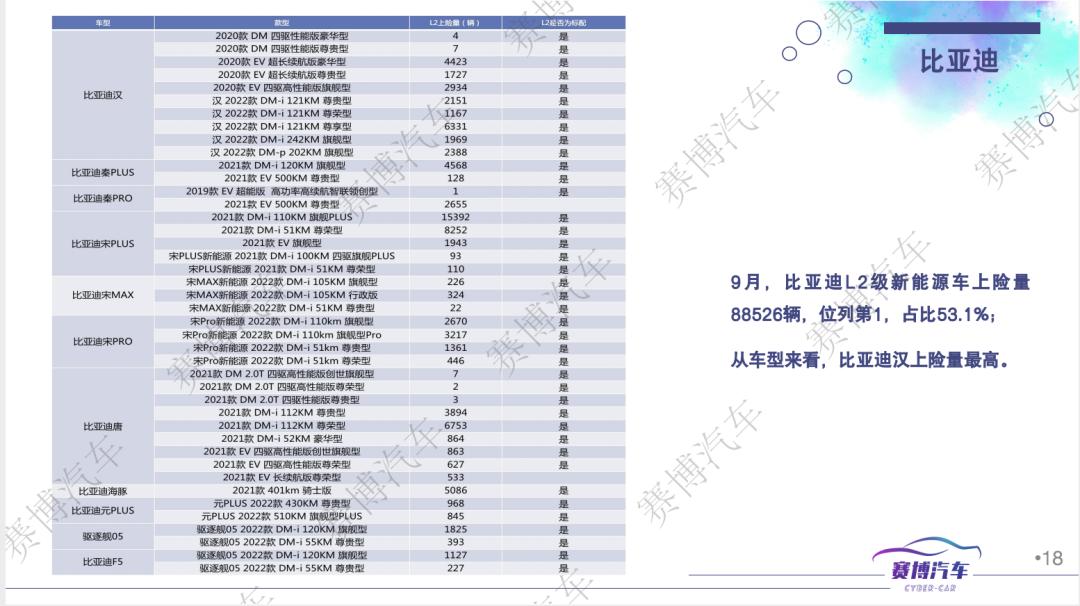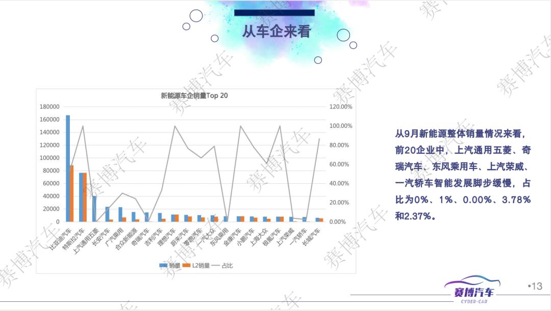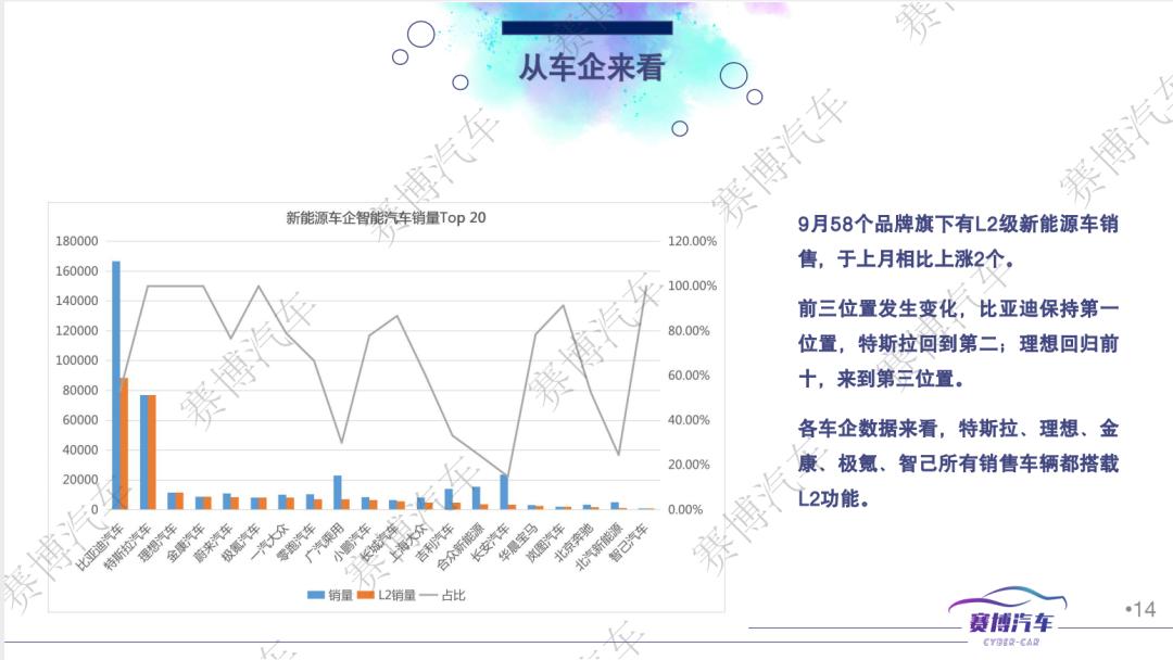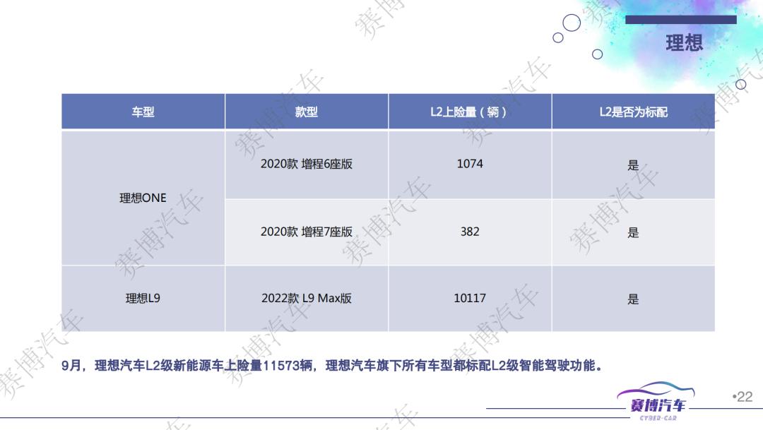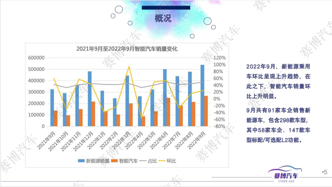 - 2022年9月共有91家车企销售新能源车,包含298款车型,其中58家车企、147款车型标配/可选配L2功能。新能源车销量中智能汽车占比为49.72%,高于8月的44.62%。