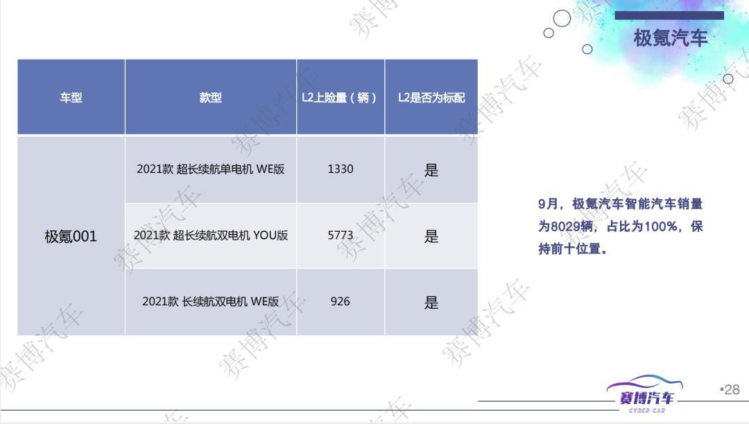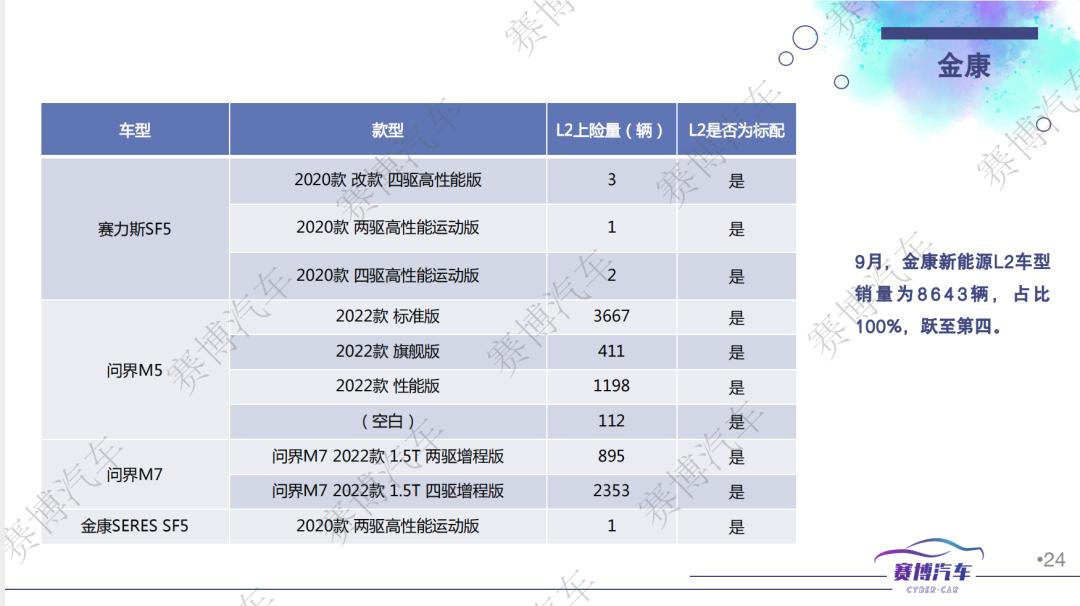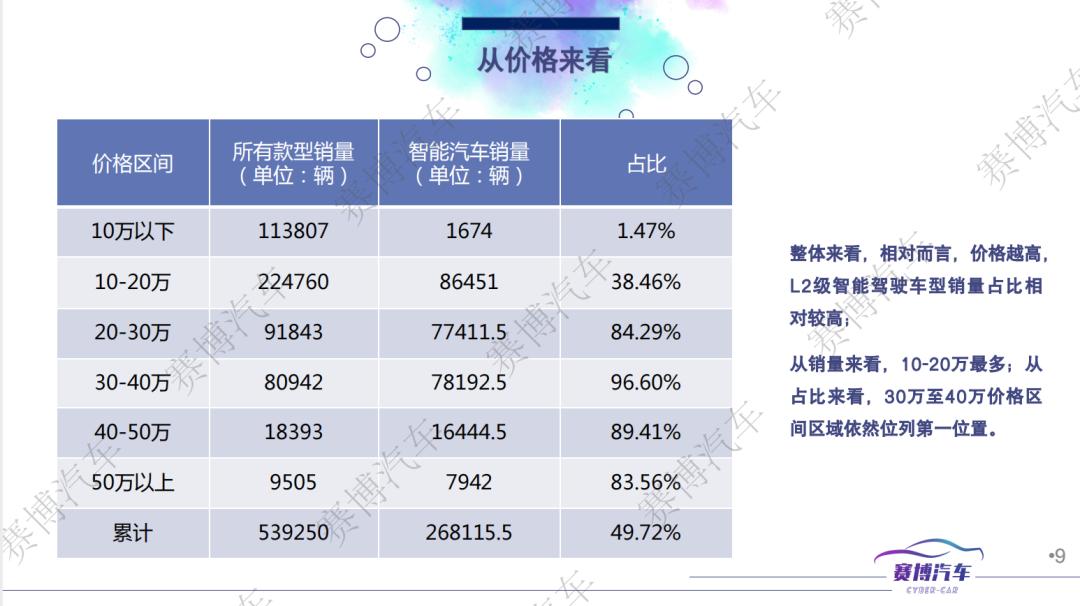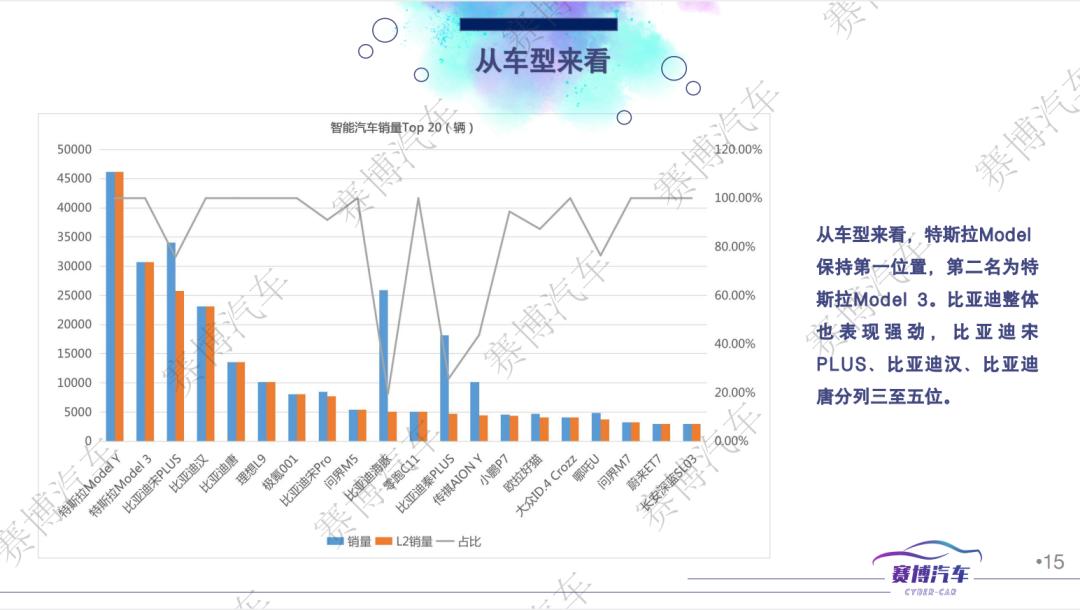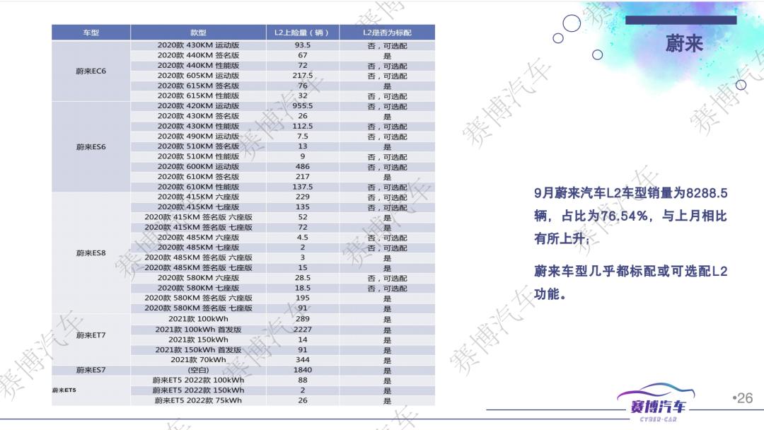 - 2022年9月共有91家车企销售新能源车,包含298款车型,其中58家车企、147款车型标配/可选配L2功能。新能源车销量中智能汽车占比为49.72%,高于8月的44.62%。