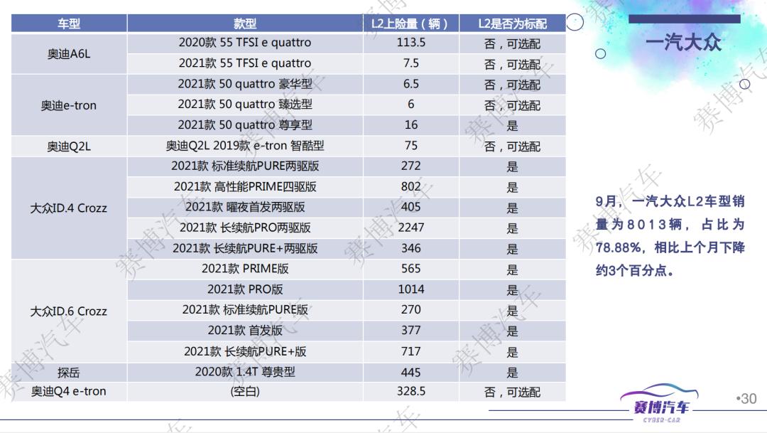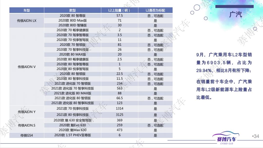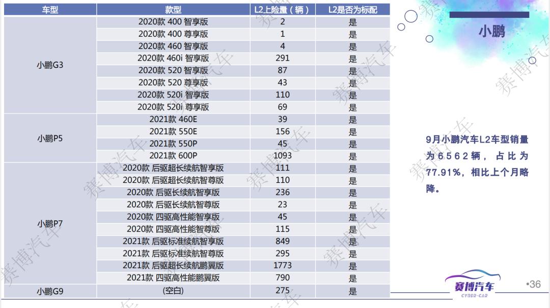 - 9月底至10月中下旬,共上市/新增搭载L2级智能驾驶功能的新能源车13款,全部标配OTA,仅海马7X-E部分车型不具备车联网功能;