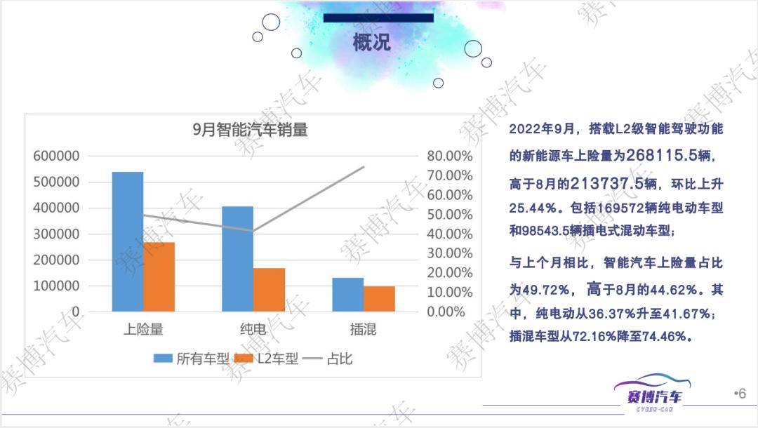 - 赛博汽车基于新能源乘用车终端销售数据(以下简称“销量”)计算发现:2022年9月智能汽车(即:具备自适应巡航或全速自适应巡航,同时又配备车道保持辅助系统的车型)销量为268115.5辆,环比上升25.44%。