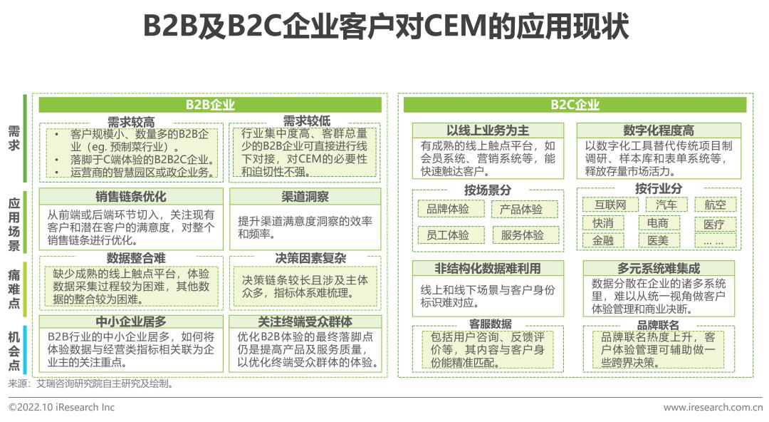 目前CEM在B2C企业中的需求较广阔,主要集中于以线上业务为主及数字化程度较高的企业客户中,且存在丰富的落地实践案例,但对于企业内部系统的打通及非结构化客户体验数据的治理和利用尚不到位。机会点方面,由于与NLP及客户旅程高度相关,且能与客户身份一一对应,客服数据的有效利用将成为未来B2C企业在客户体验管理上的新增长点。此外,品牌联名越发受到消费者追捧,CEM可用于在跨界场景中寻找客户体验的新关注点,辅助企业做品牌方面的决策。相较于B2C企业客户,CEM在B2B企业中的应用尚未成熟,主要原因系决策链条长、涉及主体众多且缺乏线上触点平台,导致业务指标难梳理以及相关数据难集成。但长远来看,中小企业是B2B领域的主力军,若CEM厂商在体验数据与经营指标的结合,以及惠及终端客户方面下足功夫,未来CEM在B2B领域的价值也将得到释放。